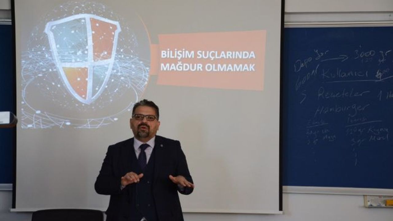 "TBD olarak gençlerimizi yönlendirmek ve bilişim suçlarında mağdur olmamak için bir farkındalık için sizlerle bu seminerde buluştuk. Gelişen modern dünyada artık tüm disiplinler birlikte çalışmak zorunda. Özellikle bilişim ve hukuk ayrıştırılamaz bir gerçek. 100 kişi siber dolandırıcılığa maruz kalıyor fakat hepsi gün yüzüne çıkarılamıyor. Çünkü bu suçları işleyen kişilerin bulunması konusunda insanlar çekimser yaklaşıyor. Oltalama yöntemiyle işlenecek suç ile ilgili karşı tarafı ikna etmeye çalışıyorlar. Biz bunlara sosyal mühendis diyoruz. Bu sosyal mühendislerin ikna ve etkileme kabiliyetleri oldukça yüksektir. Senaryo üreterek o bilişim ağında kişisel verilerinizi elde etmeye çalışıyorlar. Bilişim suçlarından korunmak için ücretsiz Wİ-Fİ ağlarına bağlanmaktan kaçınmak ve teknolojik cihaz ekranlarını paylaşmamak gerekir. Kişisel verileri korumak bilişim için oldukça önemlidir. Her türlü mağduriyeti yaşamamak için sadece kişisel verileri korumak değil aynı zamanda sosyal medya güvenliğine de dikkat etmemiz gerekir."