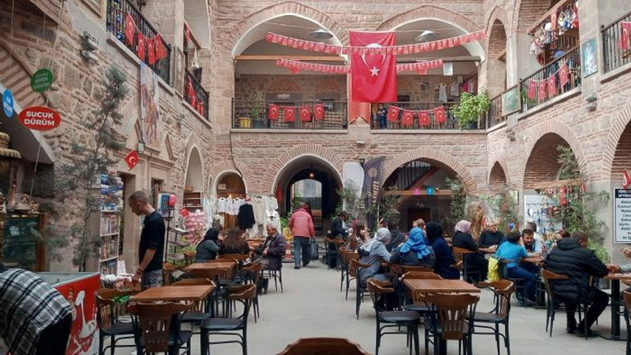 Öte yandan, hana gelen ziyaretçiler ise alışverişlerini yaptıktan sonra kafede tarihin izlerini seyrederek sıcak ve soğuk içecekleri