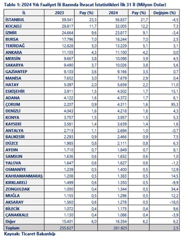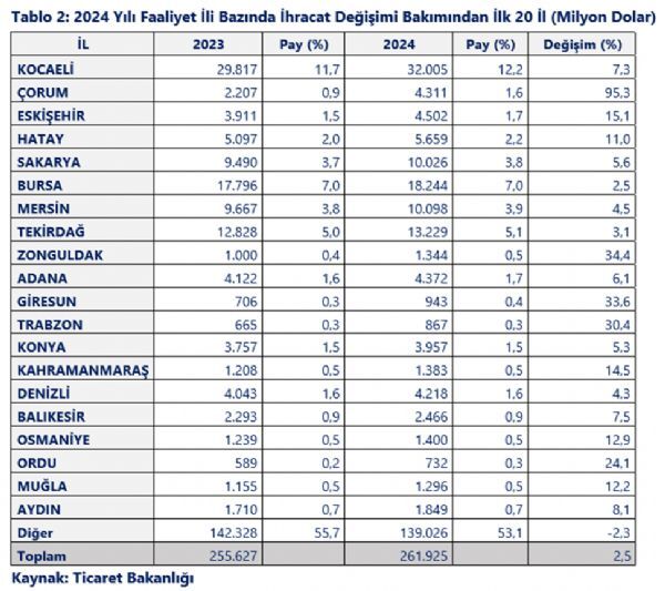 2024 yılında geçen yıla göre ihracatını en fazla artıran il Kocaeli oldu. Kocaeli, 2 milyar 188 milyonluk artışla birinci sırada, Çorum 2 milyar 104 milyonluk artışla ikinci sırada, Eskişehir ise 591 milyonluk artışla üçüncü sırada yer aldı.