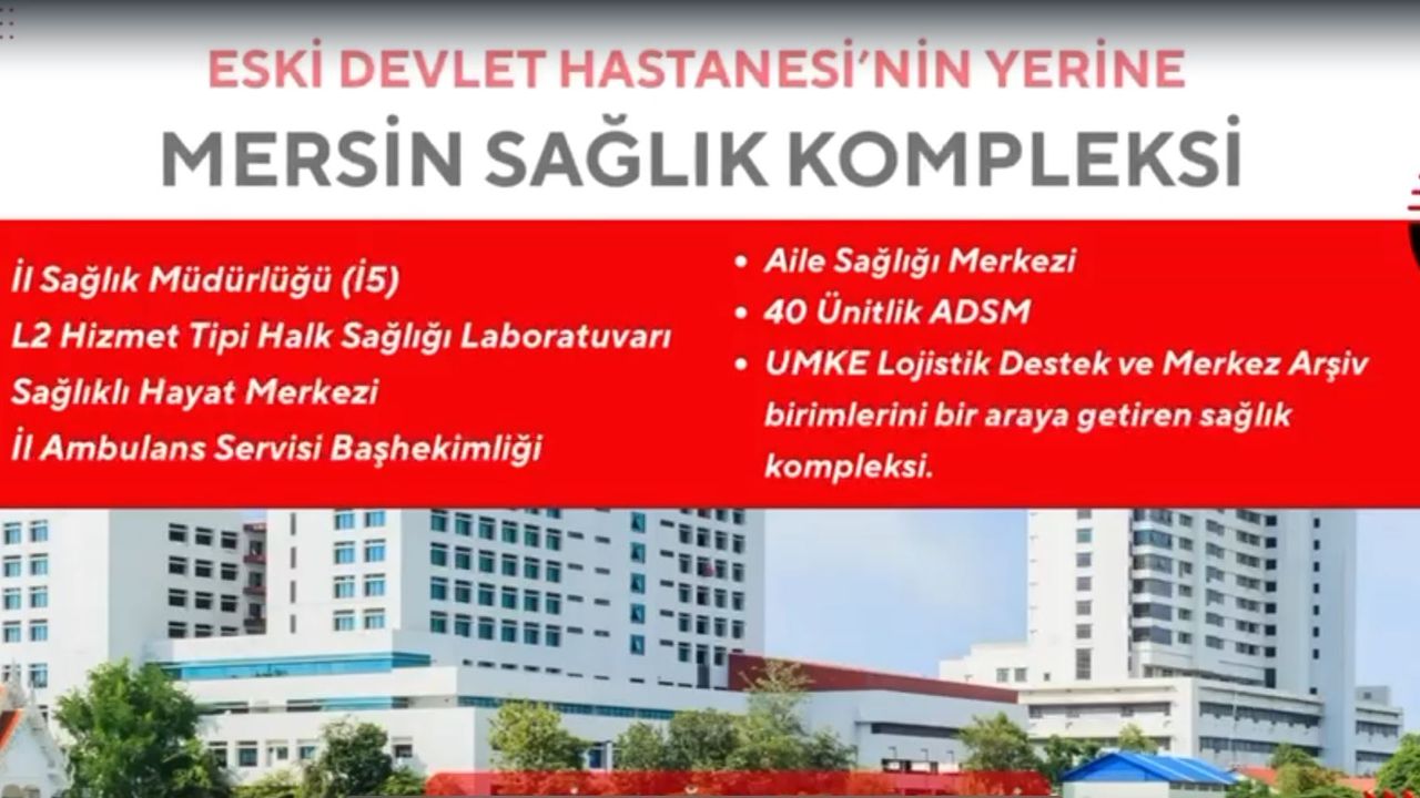 Eski devlet hastanesinin bulunduğu alana, Mersin’e yakışır büyük bir sağlık kompleksi inşa ediliyor. Bu kompleks bünyesinde; İl Sağlık Müdürlüğü, L2 hizmet tipi Halk Sağlığı Laboratuvarı, Sağlıklı Hayat Merkezi, İl Ambulans Servisi Başhekimliği, Aile Sağlığı Merkezi, 40 ünitlik Ağız ve Diş Sağlığı Merkezi, UMKE lojistik destek birimleri ve merkez arşiv yer alacak. Sağlık alanındaki birçok birimin tek merkezde toplanmasıyla koordinasyon ve hizmet kalitesi üst seviyeye taşınacak.