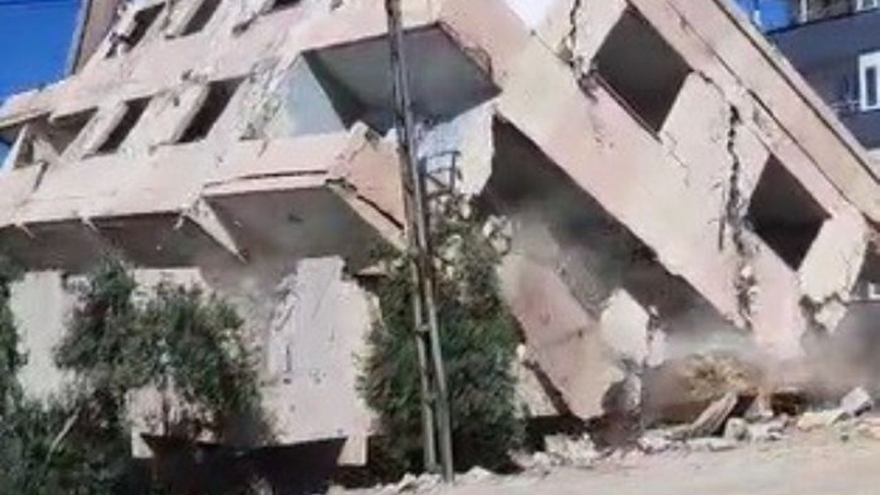 Hatay'ın Antakya ilçesinde 4 katlı binanın iş makinesinin darbesiyle yerle bir olduğu anlar kameraya yansıdı.