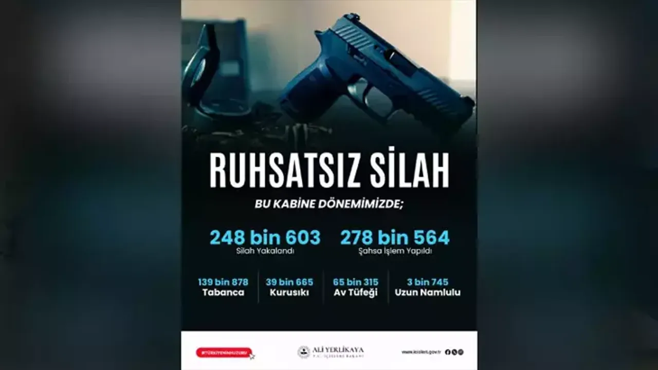 Operasyonlarda ele geçirilen silahların türlerine göre dağılımı şöyle: 766 ruhsatsız tabanca, 428 kurusıkı tabanca, 649 av tüfeği ve 24 adet uzun namlulu silah. Bakan Yerlikaya, bu gelişmeyi sosyal medya hesabından paylaştı.