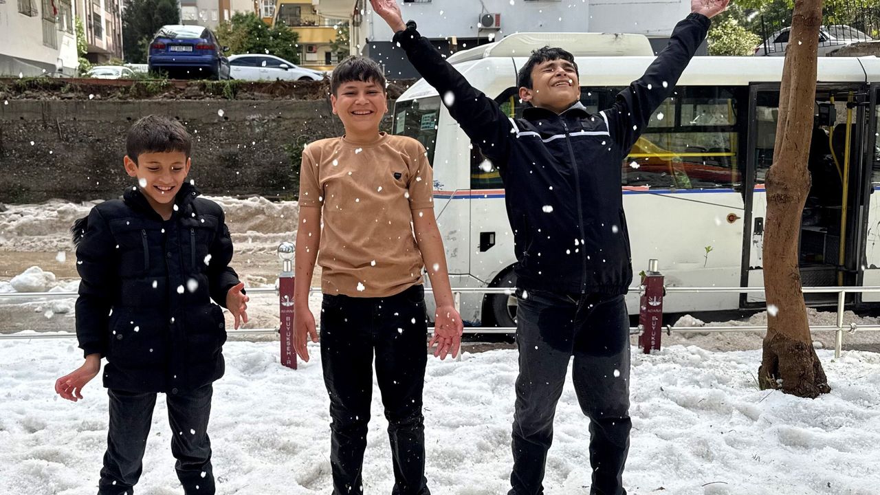 Türkiye'nin en sıcak illerinden Adana'da dün akşam etkili olan dolu ve sağanak yağmur nedeniyle merkez Çukurova ilçesine bağlı Huzurevleri Mahallesi'nde buz kütleleri oluştu. Sabah saatlerinde ise erimeyen kar kütlelerini gören çocuklar, soluğu parklarda aldı.