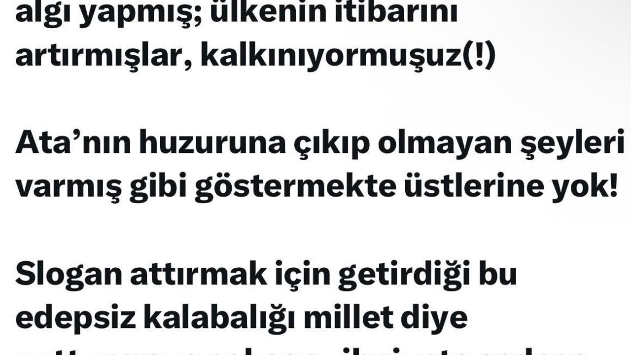 "Yahu hadsiz, Cumhurbaşkanımız Sayın Recep Tayyip Erdoğan ve AK Parti liderliğinde ülkemizin savunma sanayi başta olmak üzere yaptığı devrimleri anlamaya senin hayalin de yetmez, çapın da. Cumhurbaşkanımız Sayın Recep Tayyip Erdoğan ve AK Parti liderliğinde Türkiye büyüyor, güçleniyor."