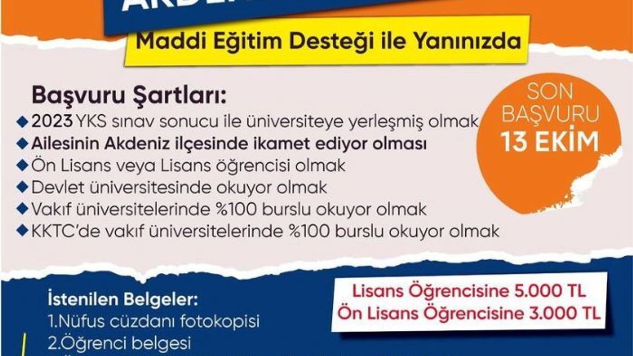 Akdeniz Belediyesi'nin sağlayacağı eğitim desteğinden faydalanmak için gereken şartlar ise şöyle; "2023 YKS sonucu ile üniversiteye yerleşmiş olmak. Ön lisans veya lisans öğrencisi olması; Ailesinin Akdeniz ilçesinde ikamet ediyor olması; Devlet üniversitesinde okuyor olmak. Vakıf üniversitelerinde yüzde 100 burslu okuyor olmak. KKTC'de vakıf üniversitelerinde yüzde 100 burslu okuyor olmak."