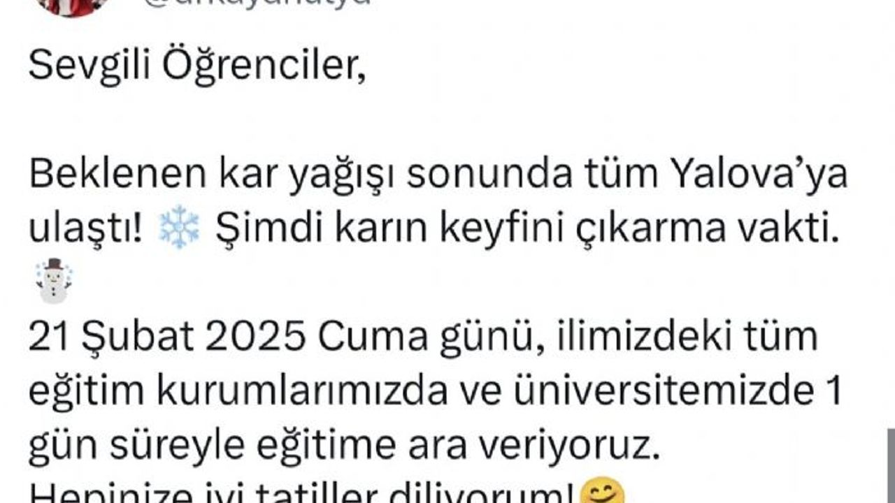 Yalova'da kar yağışı aralıklarla etkisini sürdürürken, eğitime yarın ara verildi. Tatil kararını sosyal medya hesabından duyuran Yalova Valisi Hülya Kaya, "Sevgili öğrenciler, beklenen kar yağışı sonunda tüm Yalova'ya ulaştı. Şimdi karın keyfini çıkarma vakti. 21 Şubat Cuma günü ilimizdeki tüm eğitim kurumlarımızda ve üniversitemizde eğitime 1 gün süreyle ara veriyoruz. Hepinize iyi tatiller diliyorum" ifadelerine yer verdi