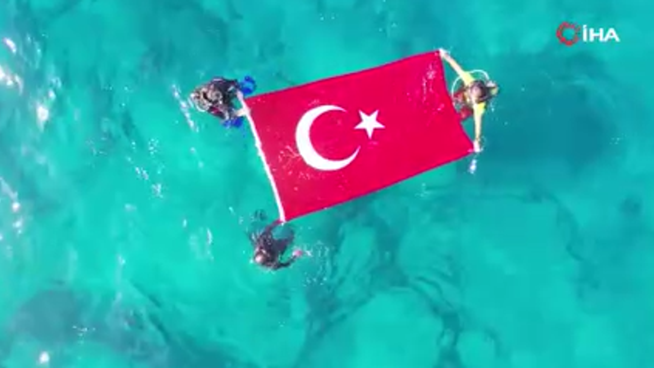 Sualtındaki kutlamanın ardından AKUB ekipleri, Koru Sahili’nde dev bir Türk bayrağı açarak vatandaşlarla birlikte hatıra fotoğrafları çekildi. Dalgalanan bayrak önünde, zaferin 103'üncü yılı coşku ve gururla kutlandı.
