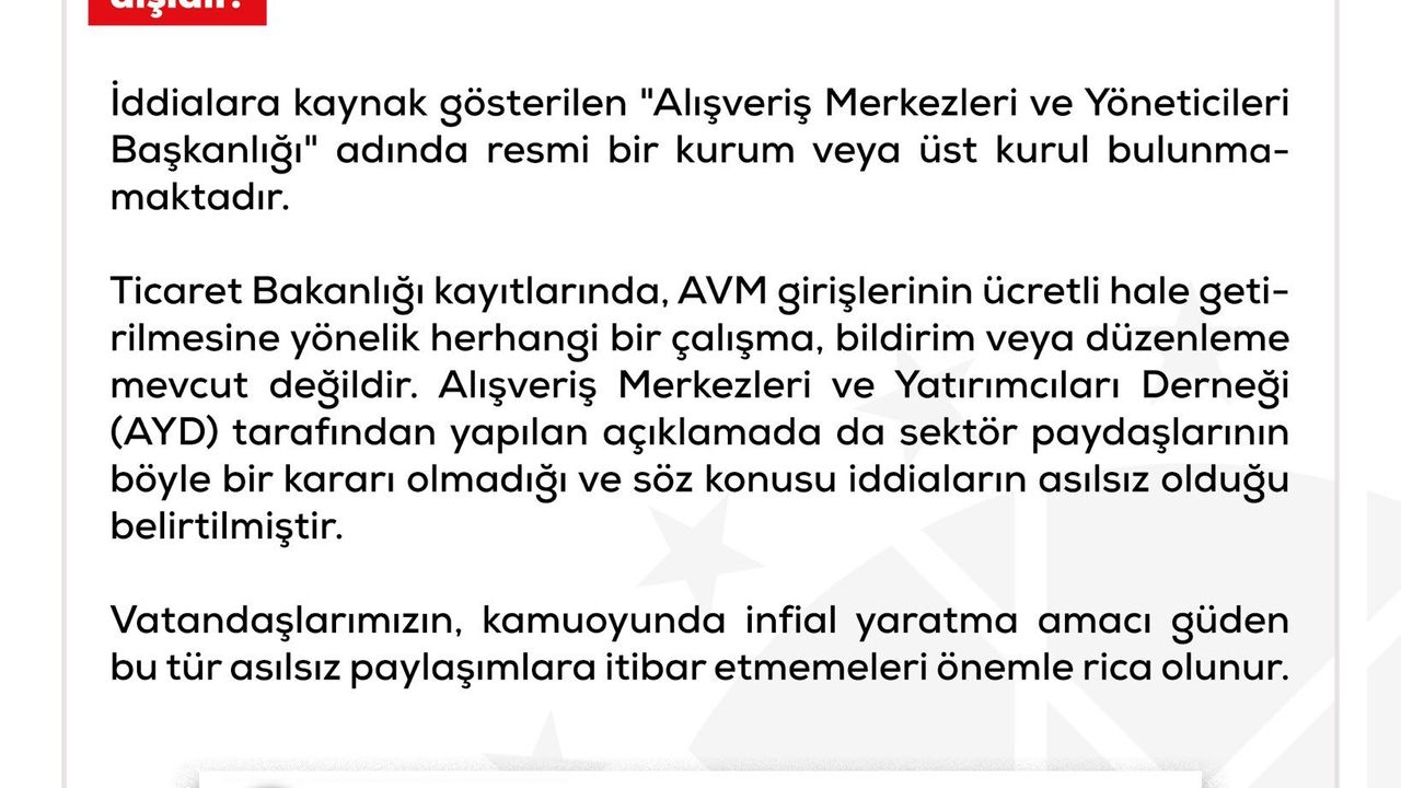 DMM'nin sanal medya hesabından yapılan açıklamada, "Bazı sosyal medya hesaplarından paylaşılan 'Alışveriş Merkezleri ve Yöneticileri Başkanlığı'nın kararıyla AVM'lere girişlerin ücretli olacağı' yönündeki iddialar tamamen gerçek dışıdır. İddialara kaynak gösterilen 'Alışveriş Merkezleri ve Yöneticileri Başkanlığı' adında resmi bir kurum veya üst kurul bulunmamaktadır. Ticaret Bakanlığı kayıtlarında, AVM girişlerinin ücretli hale getirilmesine yönelik herhangi bir çalışma, bildirim veya düzenleme mevcut değildir. Alışveriş Merkezleri ve Yatırımcıları Derneği (AYD) tarafından yapılan açıklamada da sektör paydaşlarının böyle bir kararı olmadığı ve söz konusu iddiaların asılsız olduğu belirtilmiştir. Vatandaşlarımızın, kamuoyunda infial yaratma amacı güden bu tür asılsız paylaşımlara itibar etmemeleri önemle rica olunur" denildi.
