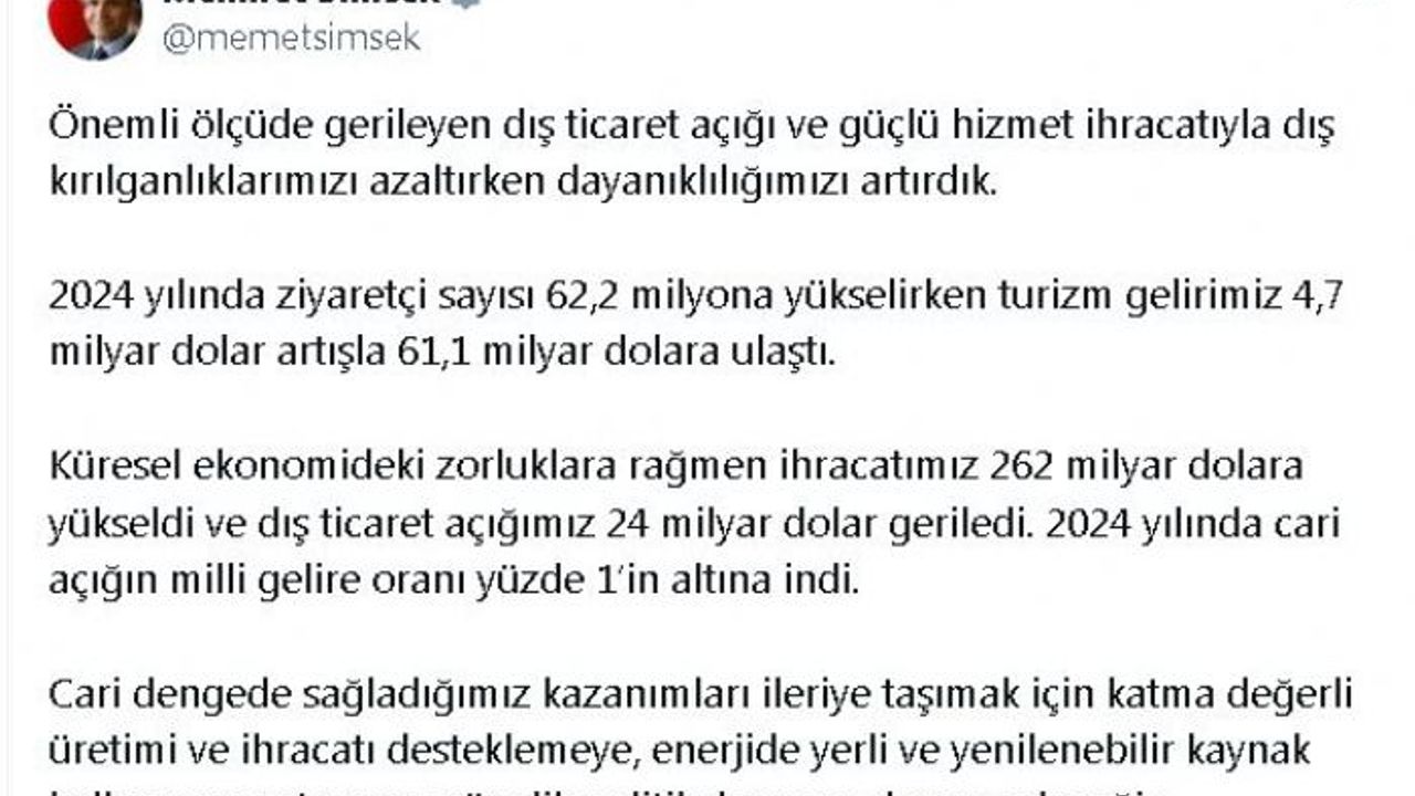 Bakan Şimşek, dış ticaret istatistiklerine ilişkin sosyal medya hesabından yaptığı açıklamada, "Önemli ölçüde gerileyen dış ticaret açığı ve güçlü hizmet ihracatıyla dış kırılganlıklarımızı azaltırken dayanıklılığımızı artırdık. 2024 yılında ziyaretçi sayısı 62,2 milyona yükselirken turizm gelirimiz 4,7 milyar dolar artışla 61,1 milyar dolara ulaştı. Küresel ekonomideki zorluklara rağmen ihracatımız 262 milyar dolara yükseldi ve dış ticaret açığımız 24 milyar dolar geriledi. 2024 yılında cari açığın milli gelire oranı yüzde 1'in altına indi. Cari dengede sağladığımız kazanımları ileriye taşımak için katma değerli üretimi ve ihracatı desteklemeye, enerjide yerli ve yenilenebilir kaynak kullanımını artırmaya yönelik politikalarımıza devam edeceğiz" dedi.