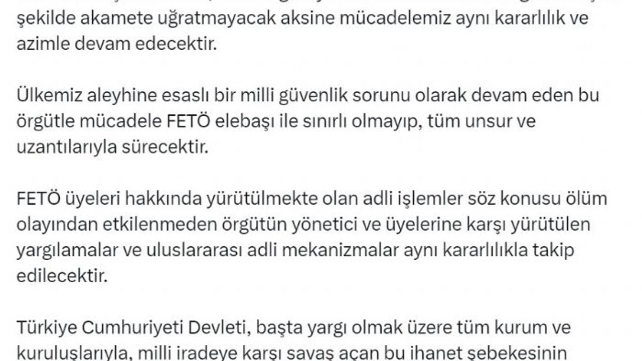 Tunç, "FETÖ elebaşının ölümü, terör örgütüyle mücadeledeki kararlığımızı hiçbir şekilde akamete uğratmayacak, aksine mücadelemiz aynı kararlılık ve azimle devam edecektir. Ülkemiz aleyhine esaslı bir milli güvenlik sorunu olarak devam eden bu örgütle mücadele FETÖ elebaşı ile sınırlı olmayıp, tüm unsur ve uzantılarıyla sürecektir. FETÖ üyeleri hakkında yürütülmekte olan adli işlemler söz konusu ölüm olayından etkilenmeden örgütün yönetici ve üyelerine karşı yürütülen yargılamalar ve uluslararası adli mekanizmalar aynı kararlılıkla takip edilecektir. Türkiye Cumhuriyeti Devleti, başta yargı olmak üzere tüm kurum ve kuruluşlarıyla, milli iradeye karşı savaş açan bu ihanet şebekesinin kalıntılarını temizlemekten asla vazgeçmeyecek, milletimizin huzuru ve güvenliği için gereken her adım atılmaya devam edilecek, hain örgütün her bir üyesi Türk adaleti önünde mutlaka hesap verecektir" dedi.