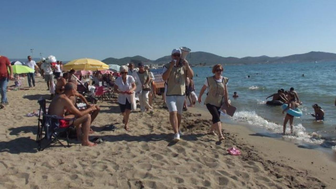 Burhaniyeli çevreciler ellerinde pankartlarla havama, suyuma toprağıma dokunma sloganları eşliğinde plajda yürüdü.