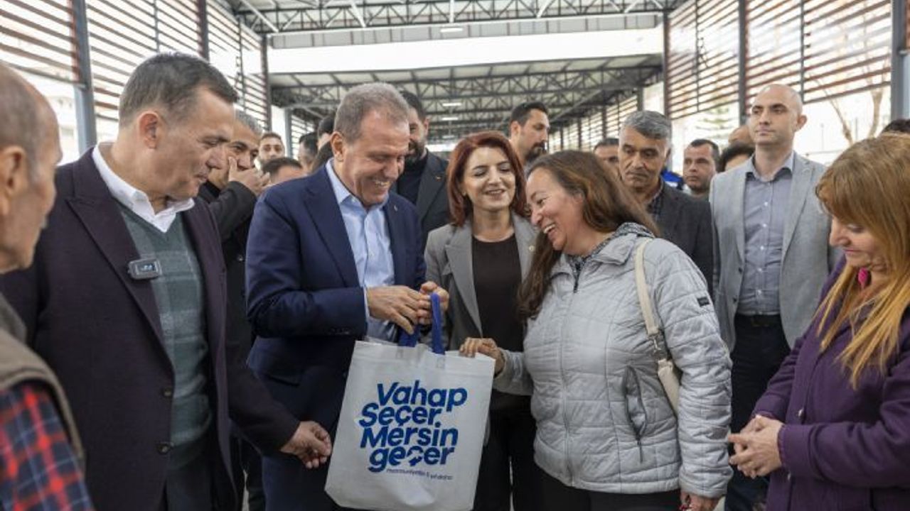 Seçer'in pazar ziyaretinde ayrıca ekipler tarafından da 'Vahap Seçer, Mersin Geçer' yazılı pazar çantaları ile bilgilendirici broşürler dağıtıldı.