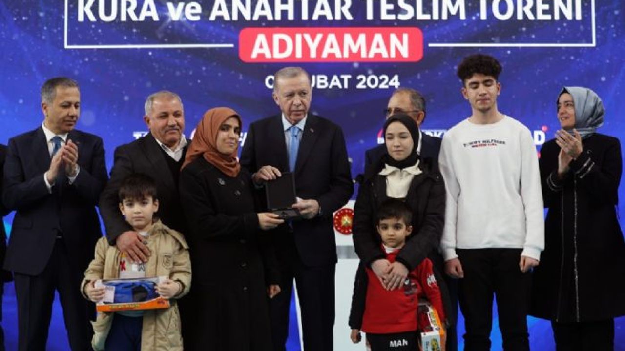 Adıyaman Üniversitesi kapalı spor salonunda gerçekleştirilen kura çekimi programında konuşan Cumhurbaşkanı Erdoğan, "Şu anda kuralar çekildi. Konutlarımızın hak sahiplerine hayırlı olmasını diliyorum. 6 Şubat depremlerinde Adıyaman en çok yara alan şehirlerden biridir. Depremde Adıyaman'ımızda 8 bin 561 insanımız hayatını kaybetti. Yıkılan 6 binin üzerindeki binaya ilave olarak acil yıkılacak durumda 8 binin üzerinde ağır hasarlı olarak da 19 binin üzerinde bina vardır. Adıyaman'da yaklaşık 39 bin konut, 3 bin 400'ye yakın iş yeri ve 3 bine yakın ahır olmak üzere 45 bin 305 hak sahibi belirlendi. Bugün 2 bin 798 konutu teslim ediyoruz. Konutlarımızın hak sahiplerine hayırlı olmasını diliyorum. Halen inşaatı süren 32 bin konutumuzun yıl sonuna kadar peyderpey teslim edeceğiz. Barınma sorununu çözmek için pek çok adım attık. Adıyaman'a acil barınma ihtiyacını karşılamak üzere 91 binin üzerinde çadır gönderdik. 35 bine yakın konteyner kurarak buralarda 118 bin vatandaşımıza hizmet verdik. Toplam 1.2 milyar lira kaynak kullanarak 27 bin 609 haneye kira yardımı yaptık. Şimdi kalıcı konutlarla yeni bir safhaya geçtik. Tabi sadece konutlar yapmakla şehirlerimizin cadde ve meydanlarını yeniden düzenlemekle kalmıyoruz aynı zamanda şehirlerimizi Türkiye yüzyılına hazırlayacak temel alt yapıyı ve büyük yatırımları da hayata geçiriyoruz. Savunma sanayi yatırımlarını deprem bölgesi şehirlerimize yönlendirmek için bir iskan ve istihdam projesi başlattık. Adıyaman'ımıza savunma sanayi şirketleri ile üretim tesisi kuruyoruz. Yıl sonuna doğru faaliyete geçecek. Özel sektörümüzün şehre ilgisi artarak sürüyor. Mayıs seçimlerinde gençlerimizi desteklemek için bir fon kurma sözü vermiştik. Önceliğimiz kadın ve gençlerimiz olacak. Projelerle Adıyaman ve tüm deprem şehirlerini eskisinden daha iyi hale getireceğiz. Böylesine büyük bir felaketin altından bu kadar kısa sürede kalkabilecek bir ülke yoktur" dedi.