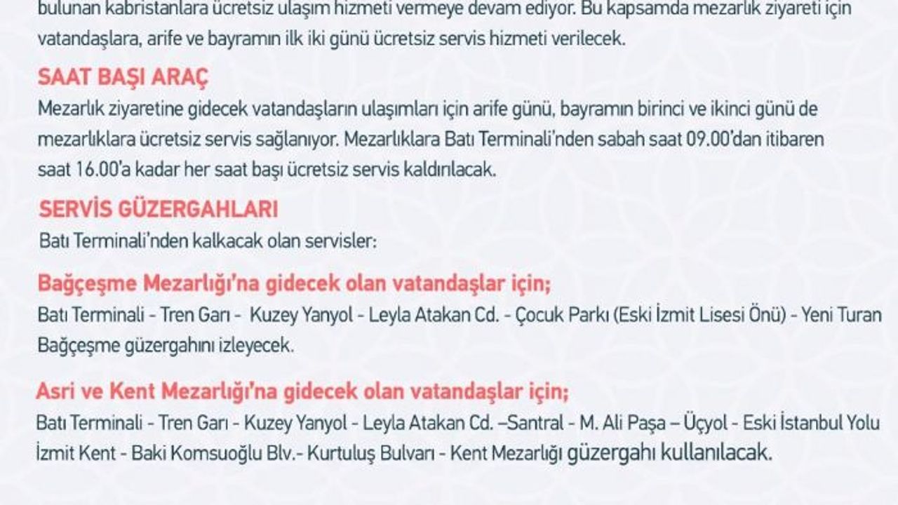 Kocaeli Büyükşehir Belediyesi dini bayramlarda Asri Mezarlık, Bağçeşme Mezarlığı ve Kent Mezarlığı'nda bulunan kabristanlara ücretsiz ulaşım hizmeti vermeye devam ediyor. Bu çerçevede, mezarlık ziyareti için vatandaşlara arife ve bayramın ilk iki günü ücretsiz servis hizmeti verilecek. Mezarlıklara Batı Terminali'nden sabah saat 09.00'dan itibaren saat 16.00'ya kadar her saat başı ücretsiz servis kaldırılacak. Ayrıca Kurban Bayramı'nda Kocaeli Büyükşehir Belediyesi Belde A.Ş'ye bağlı parkomatlı otoparklar ücretsiz olarak vatandaşlara hizmet sunacak. Bayram boyunca devam edecek uygulama ile vatandaşlar, araçlarını park etme sıkıntısı çekmeyecek.