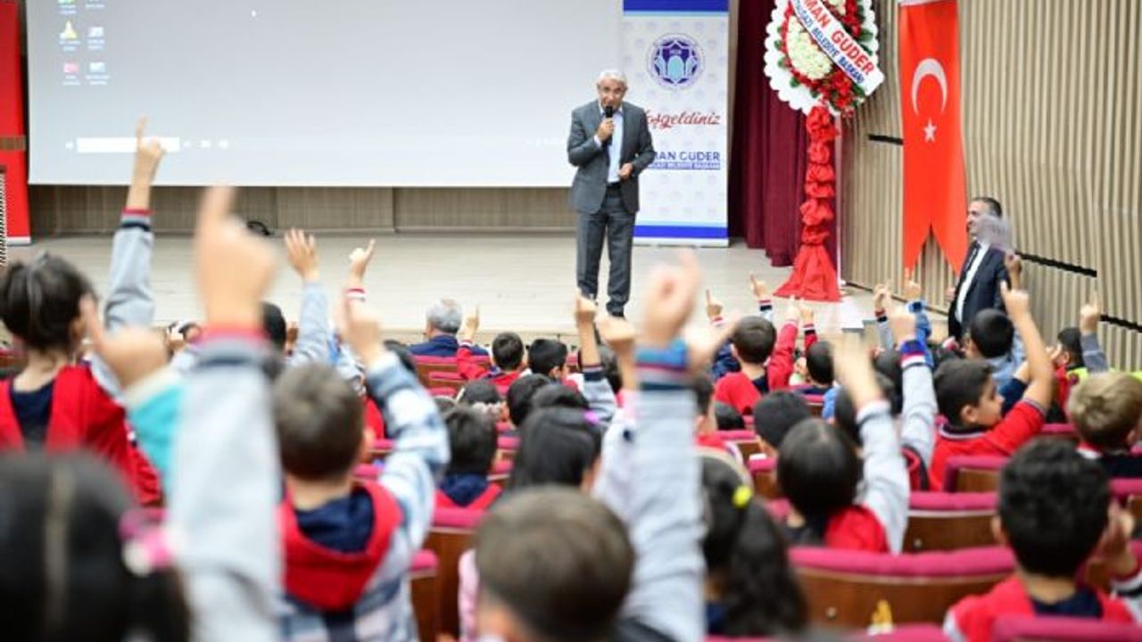 Gazi İlkokulu öğrencilerini misafir eden Başkan Güder, çocuklara kitap hediye etti.