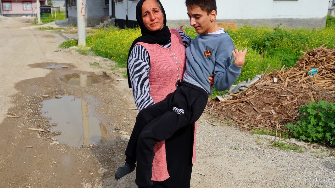 Bu sırada mahalle sakinlerinden Cemile Atay, hem zihinsel hem bedensel engelli evladı Ahmet Atay'ı (17) kucağında getirip, "Okul servisi buraya girmiyor. Her gün çocuğumu yola kadar kucağımda taşıyorum, hastalıklara kaldım" diyerek feryat etti.