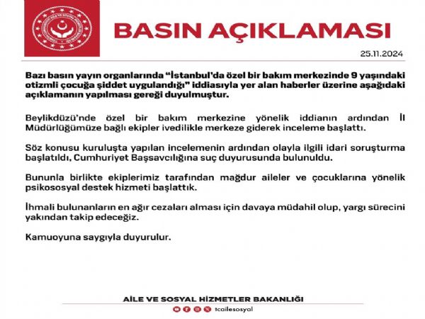 Aile ve Sosyal Hizmetler Bakanlığı'nın sosyal medya hesabından konuyla ilgili yaptığı açıklamada, "Bazı basın yayın organlarında, İstanbul'da özel bir bakım merkezinde 9 yaşındaki otizmli çocuğa şiddet uygulandığı iddiasıyla yer alan haberler üzerine aşağıdaki açıklamanın yapılması gereği duyulmuştur. Beylikdüzü'nde özel bir bakım merkezine yönelik iddianın ardından İl Müdürlüğümüze bağlı ekipler ivedilikle merkeze giderek inceleme başlattı. Söz konusu kuruluşta yapılan incelemenin ardından olayla ilgili idari soruşturma başlatıldı, Cumhuriyet Başsavcılığına suç duyurusunda bulunuldu. Bununla birlikte ekiplerimiz tarafından mağdur aileler ve çocuklarına yönelik psikososyal destek hizmeti başlattık. İhmali bulunanların en ağır cezaları alması için davaya müdahil olup, yargı sürecini yakından takip edeceğiz. Kamuoyuna saygıyla duyurulur" ifadelerine yer verildi.