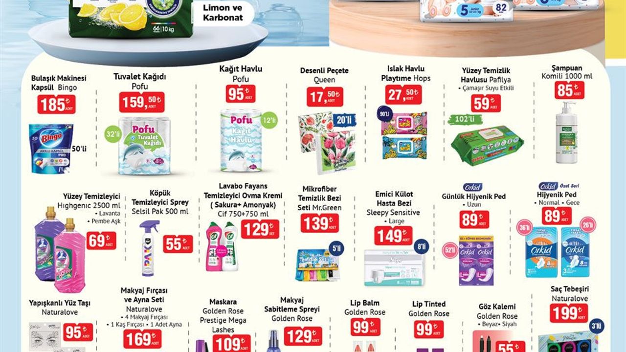 Ev temizliği ve kişisel bakım ihtiyaçlarınız için BİM, 19 Ağustos kataloğunda birbirinden avantajlı ürünler sunuyor. Özellikle temizlik malzemeleri kategorisi, bu hafta öne çıkan alanlardan biri. Rinso Toz Deterjan 10 kg, 275 TL'lik etiketiyle dikkat çekiyor. Ekonomik boyutta bir temizlik ürünü arayanlar için cazip bir seçenek sunulurken, bulaşık makinesi kullanıcıları için de Bingo Bulaşık Makinesi Kapsülü 50'li 185 TL fiyatla satışa çıkıyor. Evinizin her köşesinde kullanabileceğiniz temizlik ürünleri arasında Poşu Tuvalet Kağıdı 24'lü 159,50 TL ve Poşu Kağıt Havlu 12'li 95 TL yer alıyor.