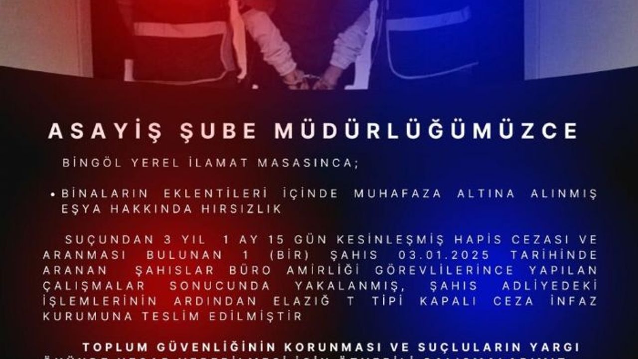Bingöl Emniyet Müdürlüğü Asayiş Şube Müdürlüğü ekiplerince binaların eklentileri içinde muhafaza altına alınmış eşya hakkında hırsızlık suçundan 3 yıl 1 ay 15 gün kesinleşmiş hapis cezası bulunan şahıs yakalandı.
