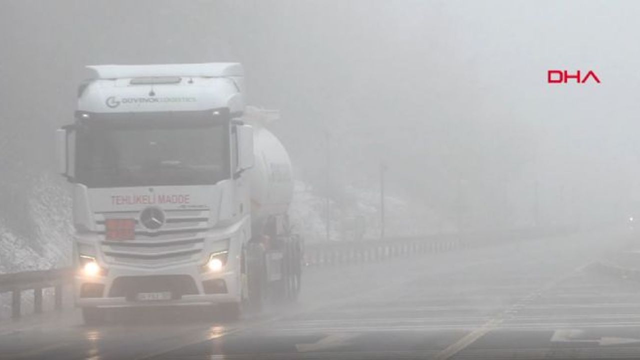 Bolu Dağı'nın D-100 kara yolu geçişinde hafif kar yağışı etkili olurken, sis nedeniyle de görüş mesafesi yaklaşık 30 metreye düştü.