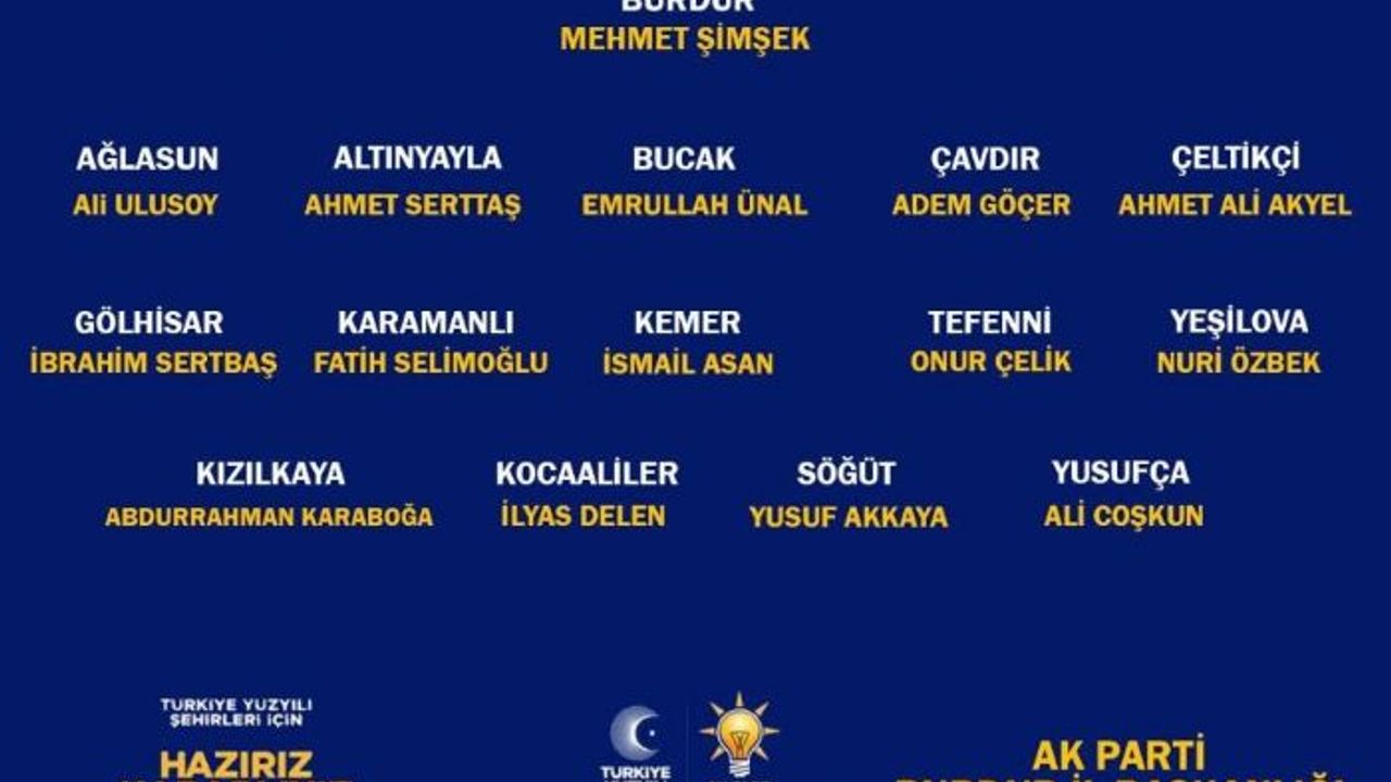 Diğer ilçelerde ise AK Parti'den aday gösterilen isimler; Çavdır ilçesi Adem Göçer, Çeltikçi ilçesi Ahmet Ali Akyel, Tefenni ilçesi Onur Çelik, Yeşilova ilçesi Nuri Özbek olarak açıklandı.