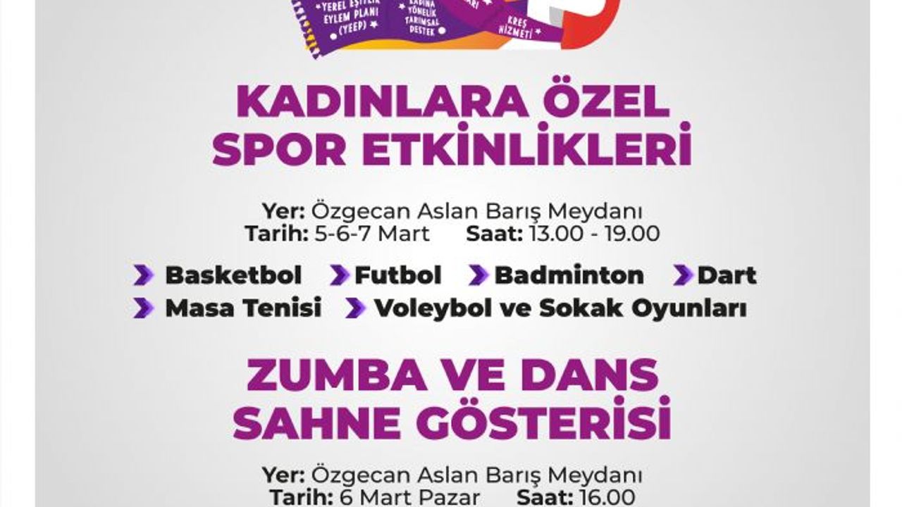 Mersin Büyükşehir Belediyesi, hayatın her alanında emekleriyle var olan kadınların gününü bir dizi etkinlikle kutlayacak. Büyükşehir, "Eşitlikte Birlik, Herkese Eşitlik" sloganıyla 8 Mart Dünya Kadınlar Günü dolayısıyla dolu dolu bir program hazırladı. Kadınlar, yürüyüşten kadın üretici stantlarına, "Eşitlikten Vazgeçmiyoruz" panelinden spor etkinliklerine, sahne gösterilerinden resim sergilerine kadar birçok etkinlikte bir araya gelecek.Sevilen sanatçı Şevval Sam, yürüyüşün ardından 8 Mart günü Özgecan Aslan Barış Meydanı'nda sahne alacak. Büyükşehir Belediyesi'nin instagram hesaplarından "sesime ses ver" diyerek kadınları davet eden Şevval Sam, şarkılarını onlar için seslendirecek.