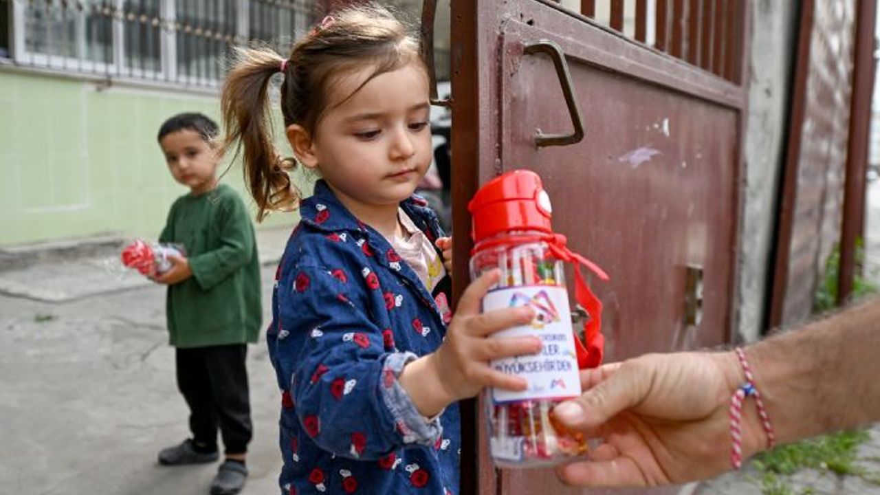 Kentin her ilçesinde mahalle mahalle çocukları sevindirmek için dolaşan Sosyal Hizmetler Dairesi Başkanlığı ekipleri, suluklara doldurdukları şekerler ile çocukların hem bayramda mutlu olmalarını hem de okula giderken susuz kalmamalarını sağladı.