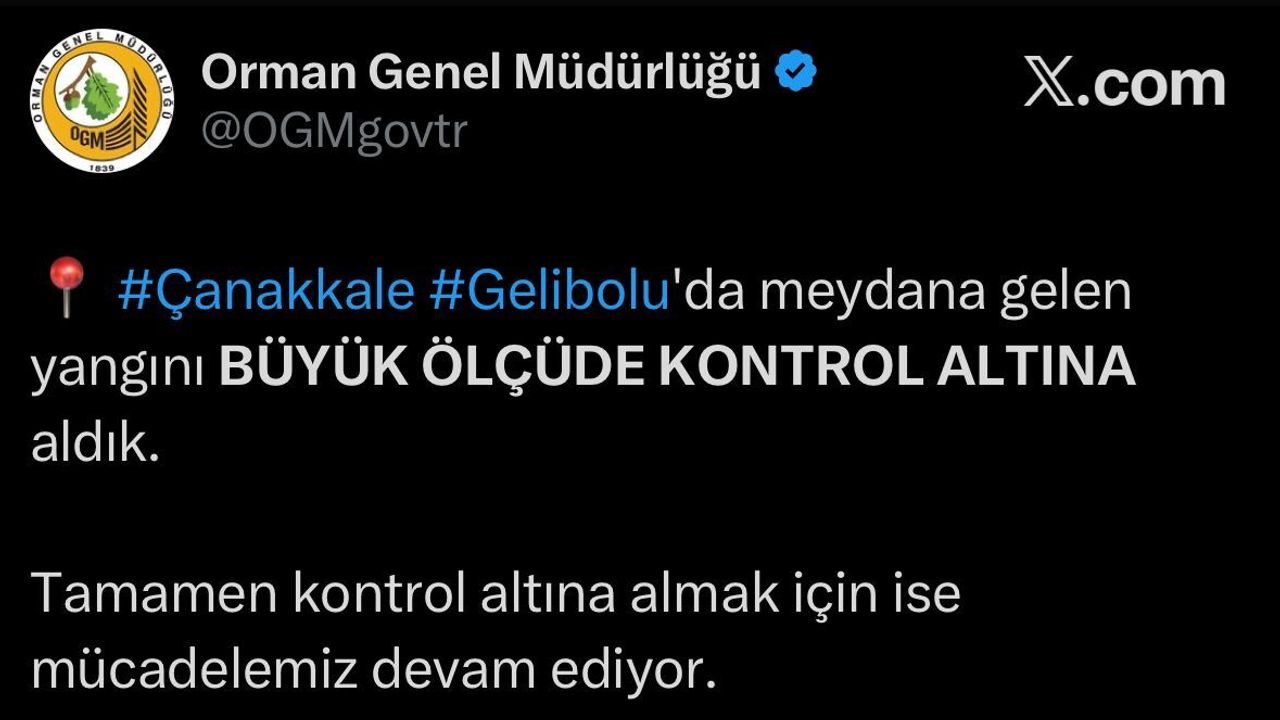 “Çanakkale Gelibolu'da meydana gelen yangını büyük ölçüde kontrol altına aldık. Tamamen kontrol altına almak için ise mücadelemiz devam ediyor.”
