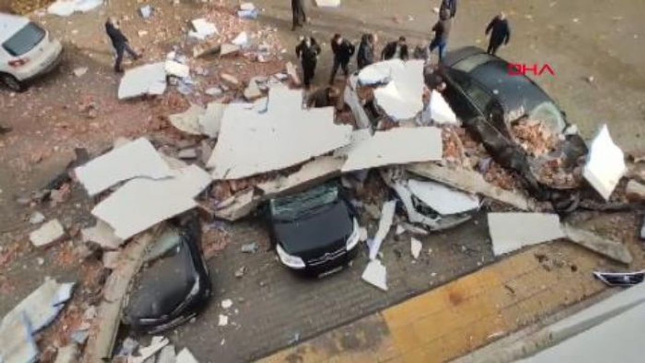 Kahramanmaraş'ta fırtına nedeniyle bir okulun çatı duvarı, veli toplantısı için okula gelenlerin araçlarının üzerine düştü.