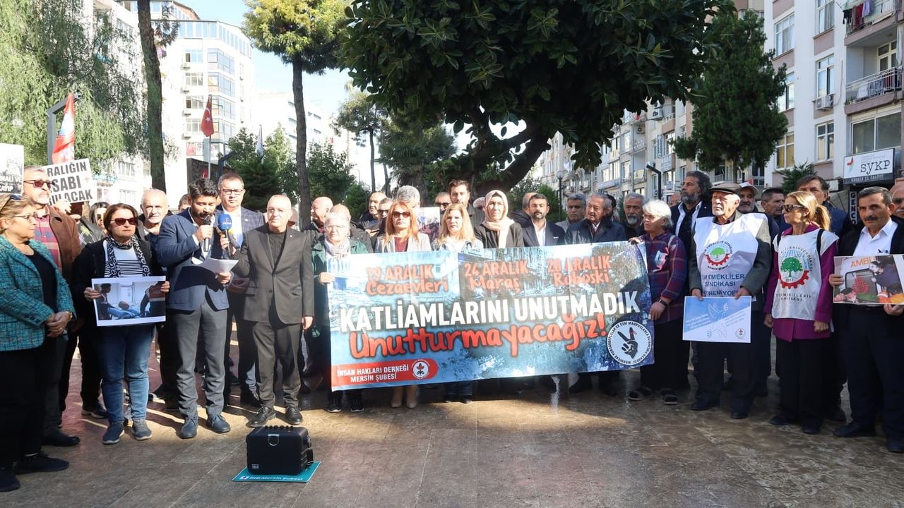 19 Aralık Cezaevlerinde İnsan Hakları İçin Mücadele ve Dayanışma Günü'nde Özgür Çocuk Parkı'nda bir araya gelen İHD Mersin Şubesi üyeleri, cezaevlerindeki sıkıntılara dikkat çekti. Burada grup adına açıklama yapan Gazi İnci, 25 yıl önce 19 Aralık’ta ağır tecrit koşullarını dayatan F tipi hapishanelerini protesto etmek amacıyla açlık grevinde olan mahpuslara yönelik 20 hapishanede eş zamanlı bir operasyon başlatıldığını hatırlatarak, "3 gün süren ve televizyonlarda canlı yayında gösterilen bu operasyonda 30 mahpus ve 2 kamu görevlisi olmak üzere 32 kişi yaşamını yitirmiş ve 300’e yakın mahpus ise yaralanmıştır. Katliamı protesto
