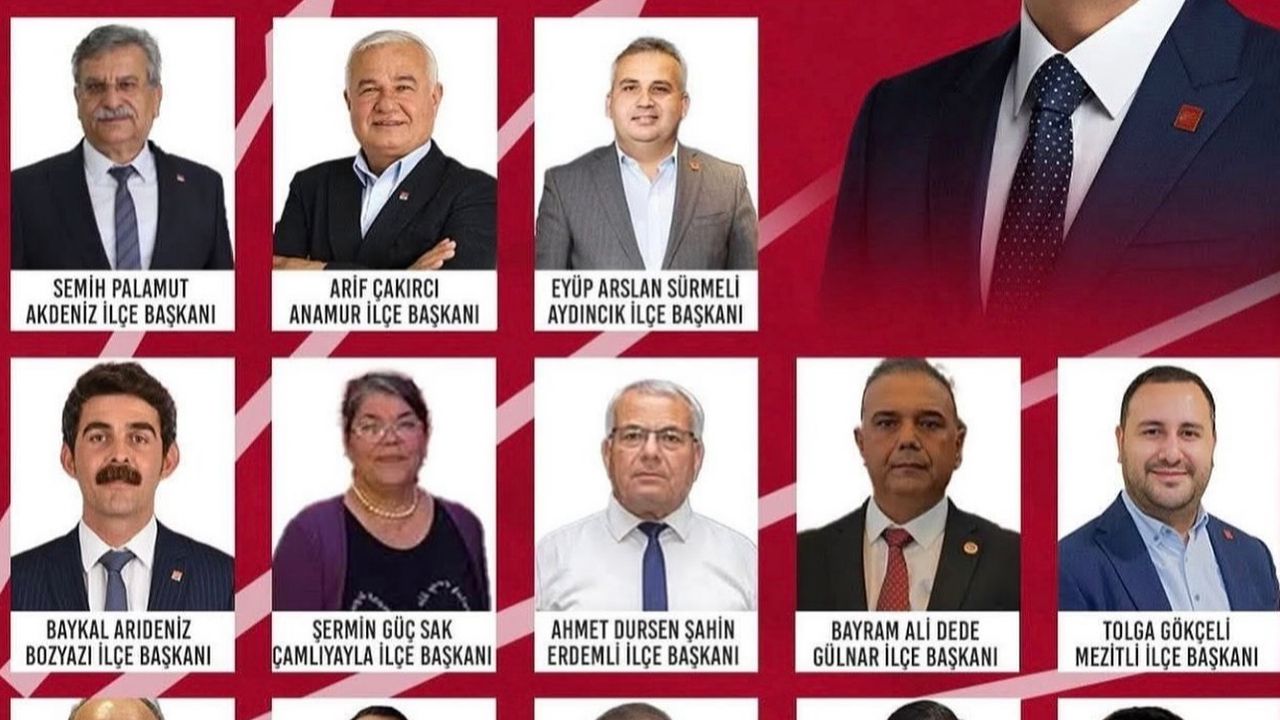 CHP Mersin İl Örgütü, 13 ilçede görev alacak başkanların isimlerini duyurdu. Tek tek resimleriyle açıklanan isimler, CHP'nin ilçe başkanlık görevlerine başladı. Açıklanan listeye göre CHP’nin Mersin’deki ilçe başkanları şu şekilde: