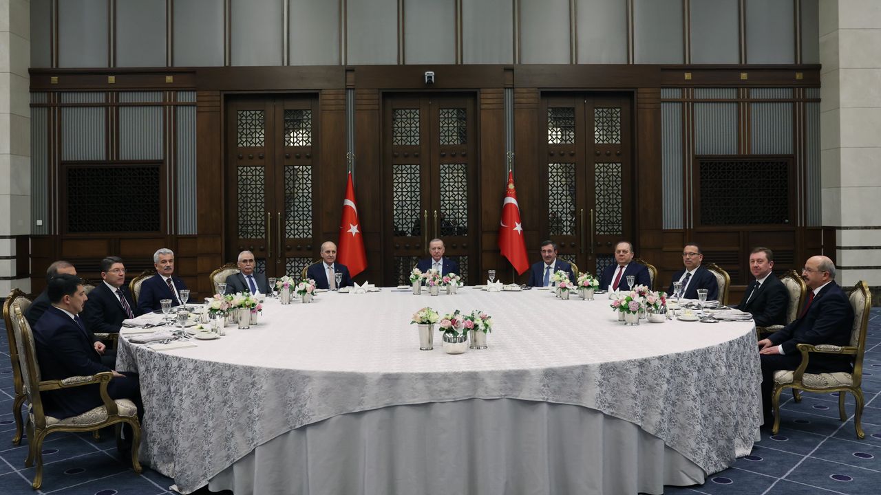 Cumhurbaşkanlığı Külliyesi'ndeki akşam yemeği, basına kapalı gerçekleştirildi. Yemeğe, TBMM Başkanı Numan Kurtulmuş, Cumhurbaşkanı Yardımcısı Cevdet Yılmaz, Anayasa Mahkemesi Başkanı Kadir Özkaya, Yargıtay Başkanı Ömer Kerkez, Danıştay Başkanı Zeki Yiğit, Sayıştay Başkanı Metin Yener, Adalet Bakanı Yılmaz Tunç, Uyuşmazlık Mahkemesi Başkanı Rıdvan Güleç, Cumhurbaşkanlığı Genel Sekreteri Hakkı Susmaz, Cumhurbaşkanlığı Özel Kalem Müdürü Hasan Doğan ve Cumhurbaşkanlığı Devlet Denetleme Kurulu Başkanı Salih Tanrıkulu da katıldı.