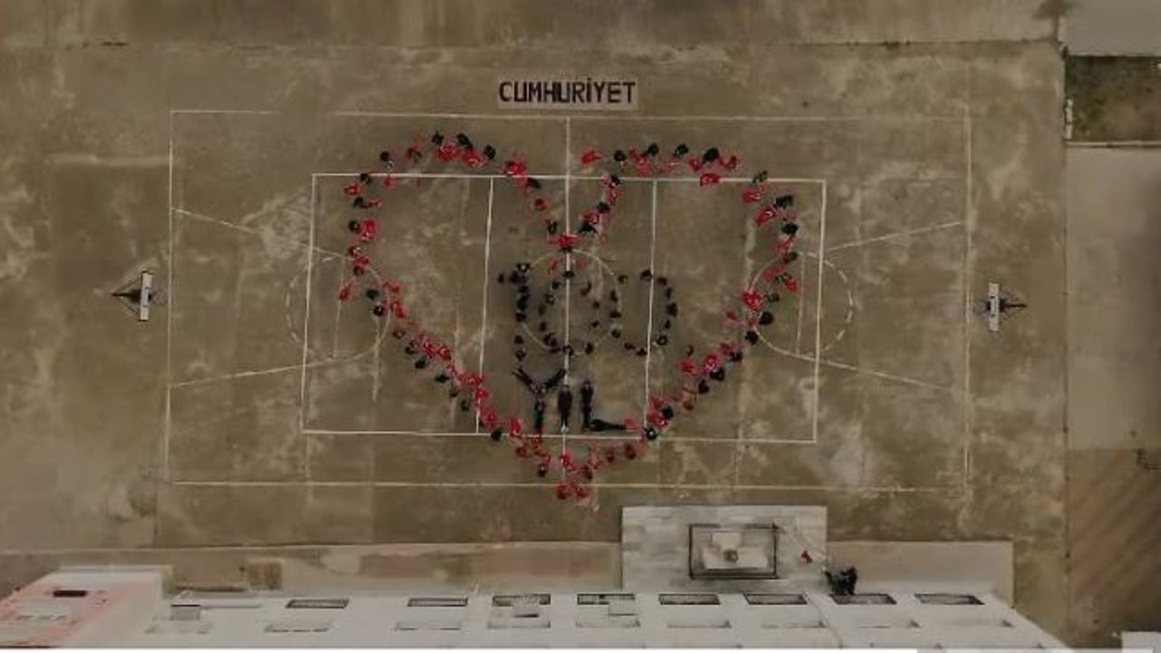 Öğrenciler okul bahçesinde Cumhuriyet'in 100. yılına özel "Kalp içerisinde 100. Yıl" koreografisi oluşturdu. Öğrencilerin gösterileri dronla görüntülendi.