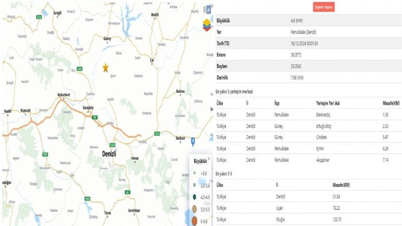 Afet ve Acil Durum Yönetimi Başkanlığı (AFAD) Deprem Dairesi'nden alınan bilgiye göre saat 03.01'de merkez üssü Denizli'nin Pamukkale ilçesi olan 4.0 büyüklüğünde deprem meydana geldi. Zeminden 7.96 kilometre derinliğinde meydana gelen deprem, il merkezi ve çevre ilçelerden de hissedildi. İlk belirlemelere göre depremde herhangi bir olumsuzluk yaşanmadı.