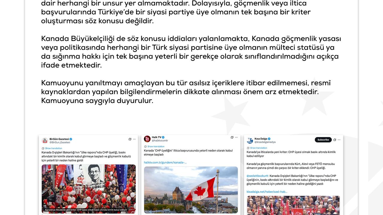 "Kanada Dışişleri Bakanlığı’nın Türkiye’ye ilişkin ülke raporlarında ya da yayımladığı bilgi notlarında, Türkiye’deki herhangi bir siyasi partinin baskı altında bulunduğuna dair herhangi bir unsur yer almamaktadır. Dolayısıyla, göçmenlik veya iltica başvurularında Türkiye’de bir siyasi partiye üye olmanın tek başına bir kriter oluşturması söz konusu değildir. Kanada Büyükelçiliği de söz konusu iddiaları yalanlamakta, Kanada göçmenlik yasası veya politikasında herhangi bir Türk siyasi partisine üye olmanın mülteci statüsü ya da sığınma hakkı için tek başına yeterli bir gerekçe olarak sınıflandırılmadığını açıkça ifade etmektedir. Kamuoyunu yanıltmayı amaçlayan bu tür asılsız içeriklere itibar edilmemesi, resmi kaynaklardan yapılan bilgilendirmelerin dikkate alınması önem arz etmektedir."