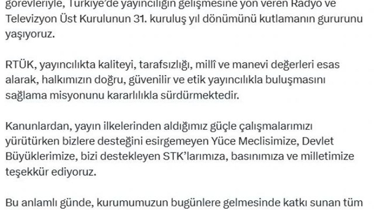 RTÜK Başkanı Şahin, sosyal medya hesabından paylaştığı mesajda, "Toplumsal sorumluluk bilinciyle yürüttüğü denetim ve düzenleme görevleriyle, Türkiye'de yayıncılığın gelişmesine yön veren Radyo ve Televizyon Üst Kurulunun 31. kuruluş yıl dönümünü kutlamanın gururunu yaşıyoruz. RTÜK, yayıncılıkta kaliteyi, tarafsızlığı, milli ve manevi değerleri esas alarak, halkımızın doğru, güvenilir ve etik yayıncılıkla buluşmasını sağlama misyonunu kararlılıkla sürdürmektedir. Kanunlardan, yayın ilkelerinden aldığımız güçle çalışmalarımızı yürütürken bizlere desteğini esirgemeyen Yüce Meclisimize, Devlet Büyüklerimize, bizi destekleyen STK'larımıza, basınımıza ve milletimize teşekkür ediyoruz. Bu anlamlı günde, kurumumuzun bugünlere gelmesinde katkı sunan tüm Başkanlarımıza, Üyelerimize ve çalışanlarımıza içten şükranlarımı sunuyor; yayıncılık ilkeleri doğrultusunda yürütülen bu önemli görevin, aynı hassasiyet ve azimle daha nice yıllar başarıyla devam etmesini diliyorum" ifadelerini kullandı.