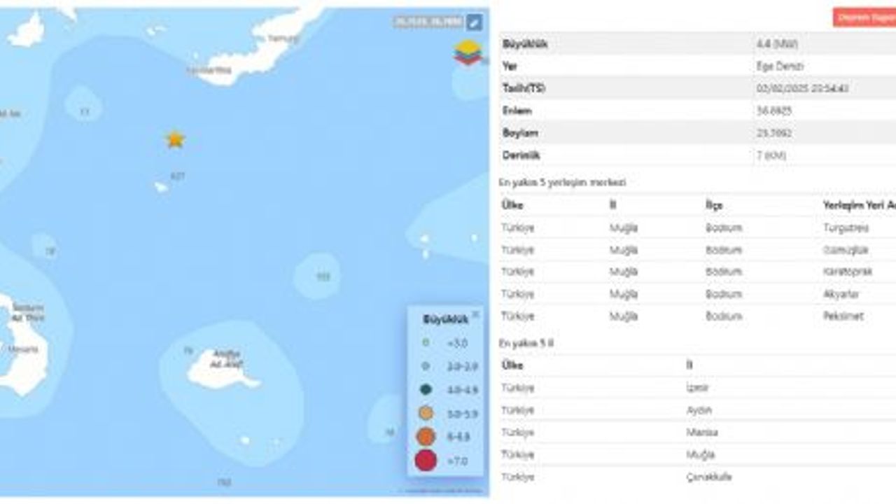 Afet ve Acil Durum Yönetimi Başkanlığı (AFAD) verilerine göre, saat 02.54'te merkez üssü Ege Denizi'nin Aniye ile Santorini Adası açıkları olan 4.4 büyüklüğünde deprem meydana geldi. Zeminden 7 kilometre derinlikte kaydedilen depremin, Türkiye sınırlarına en yakın kara parçası olan Muğla'nın Bodrum ilçesine, 142.53 kilometre uzaklıkta olduğu belirlendi. Depremde Ege bölgesinde herhangi bir olumsuzluk yaşanmadığı belirtildi.