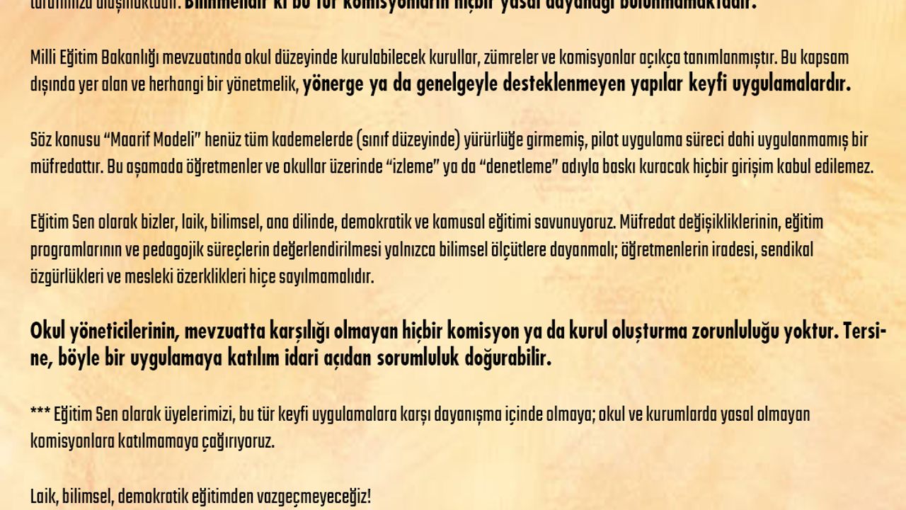Sendika, henüz tüm sınıf düzeylerinde yürürlüğe dahi girmemiş olan "Maarif Modeli" üzerinden öğretmenler üzerinde bir “izleme” ya da “denetleme” sürecinin başlatılmasının pedagojik ve hukuki açıdan kabul edilemez olduğunu belirtti. Eğitim Sen, açıklamasında laik, bilimsel, demokratik ve kamusal eğitimi savunmaya devam edeceklerini ifade etti. Müfredat değişikliklerinin pedagojik gerekçelere dayanması gerektiğinin altını çizen sendika, öğretmenlerin mesleki özerklik ve sendikal haklarına saygı duyulması gerektiğini belirtti. Açıklamanın devamında, okul yöneticilerine de çağrı yapılarak, "Okul yöneticilerinin, mevzuatta karşılığı olmayan hiçbir komisyon ya da kurul oluşturma zorunluluğu yoktur. Aksine, böyle bir uygulamaya katılım idari sorumluluk doğurabilir" ifadeleri kullanıldı.