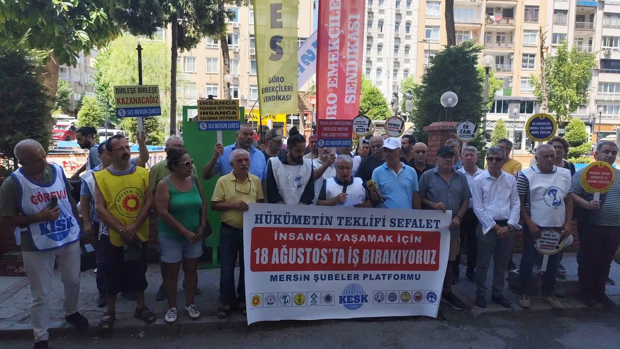 Özgür Çocuk Parkı'nda bir araya gelen KESK Mersin Şubeler Platformu üyeleri, hükümetin sunduğu zam teklifine tepki gösterdi. Grup adına konuşan Eğitim Sen Mersin Şube Başkanı Mahmut Sümbül, iktidarın kamu emekçilerine yoksulluğu reva gördüğünü belirterek, ikinci zam teklifinin talepleri karşılamaması durumunda 18 Ağustos Pazartesi günü ülke genelinde bir günlük iş bırakma eylemi gerçekleştirileceğini duyurdu. Sümbül, “Tüm sendikalı-sendikasız kamu emekçilerine sesleniyoruz: 18’inde hizmet üretmeyerek, üretimden gelen gücünüzü kullanın ve bize reva görülen sefalet ücretine karşı alanlarda olun. Kamu emekçilerinin sesini yükseltin” ifadelerini kullandı.