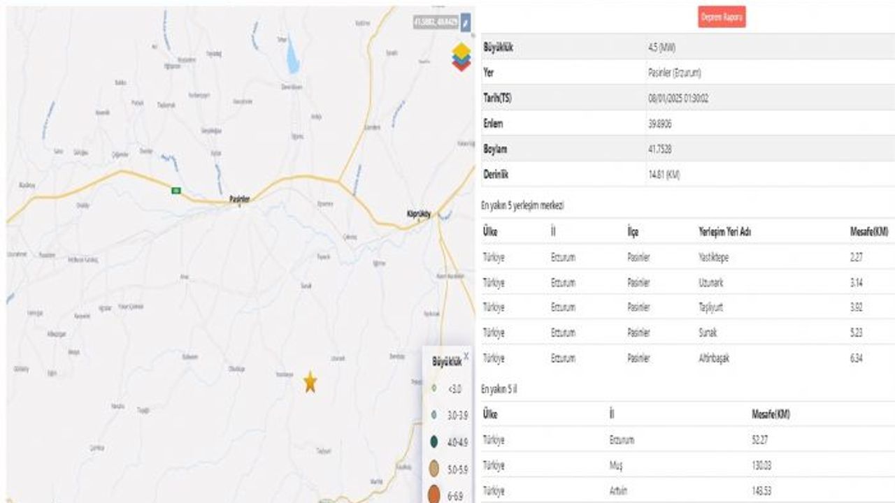 Afet ve Acil Durum Yönetimi Başkanlığı (AFAD) Deprem Dairesi'nden alınan bilgiye göre, Erzurum'un Pasinler ilçesinde saat 04.30'da yerin 14 kilometre derinliğinde, 4.5 büyüklüğünde deprem meydana geldi. Çevre ilçelerde de hissedilen depremde, ilk belirlemelere göre herhangi bir olumsuz durum yaşanmadı.