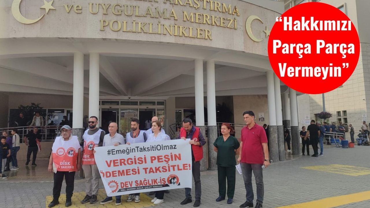 Devrimci Sağlık İşçileri Sendikası (Dev Sağlık-İş) Çukurova Bölge Şubesi ile Devrimci İşçi Sendikaları Konfederasyonu (DİSK), Mersin Üniversitesi Hastanesi önünde geriye dönük ödemelerde yaşanan adaletsizlik nedeniyle ortak basın açıklaması yaptı.