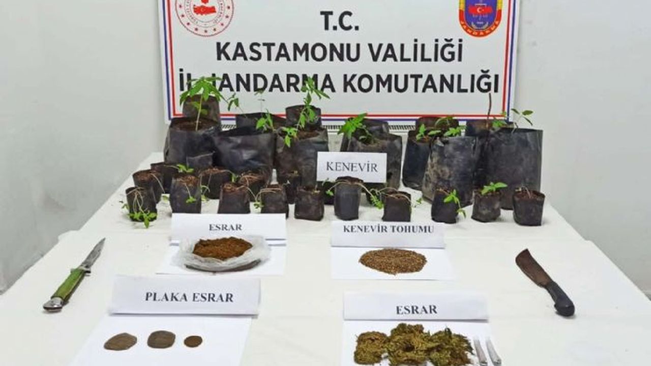 Edinilen bilgiye göre, Kastamonu İl Jandarma Komutanlığı ekiplerince uyuşturucu madde imal ve ticareti yapan şahıslara yönelik yürütülen çalışmalar neticesinde, Kastamonu'nun İnebolu ilçesinde Y.T. isimli şahsın evinde arama yapıldı. Yapılan aramada plaka haline getirilmiş bir miktar esrar ve esrar yapımı için dikilen kenevirler ele geçirildi.