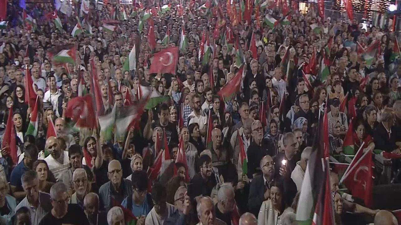 Miting boyunca sık sık “Özgür Filistin” sloganları atılırken, liderlerin konuşmaları kalabalık tarafından alkışlarla desteklendi.