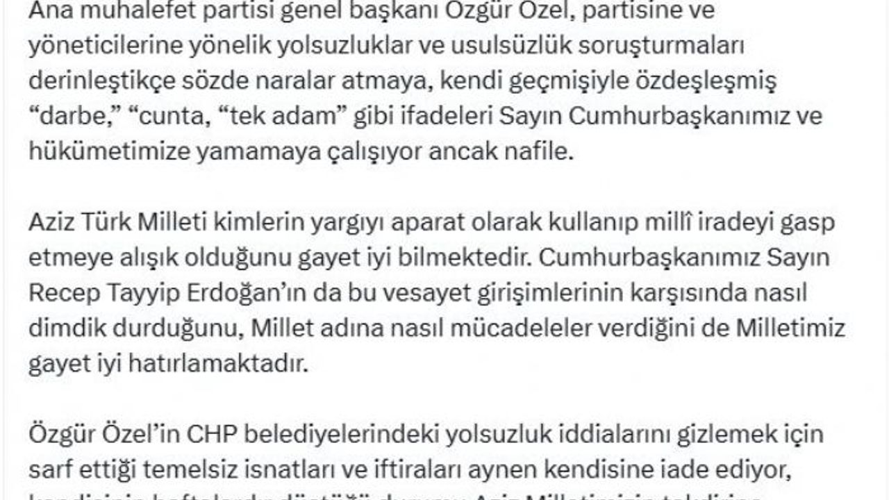 İletişim Başkanı Fahrettin Altun, sosyal medya hesabından yaptığı açıklamada, "Ana muhalefet partisi genel başkanı Özgür Özel, partisine ve yöneticilerine yönelik yolsuzluklar ve usulsüzlük soruşturmaları derinleştikçe sözde naralar atmaya, kendi geçmişiyle özdeşleşmiş 'darbe', 'cunta', 'tek adam' gibi ifadeleri Sayın Cumhurbaşkanımız ve hükümetimize yamamaya çalışıyor ancak nafile. Aziz Türk milleti kimlerin yargıyı aparat olarak kullanıp milli iradeyi gasp etmeye alışık olduğunu gayet iyi bilmektedir. Cumhurbaşkanımız Sayın Recep Tayyip Erdoğan'ın da bu vesayet girişimlerinin karşısında nasıl dimdik durduğunu, millet adına nasıl mücadeleler verdiğini de milletimiz gayet iyi hatırlamaktadır. Özgür Özel'in CHP belediyelerindeki yolsuzluk iddialarını gizlemek için sarf ettiği temelsiz isnatları ve iftiraları aynen kendisine iade ediyor, kendisinin haftalardır düştüğü durumu aziz milletimizin takdirine bırakıyoruz" ifadelerini kullandı.