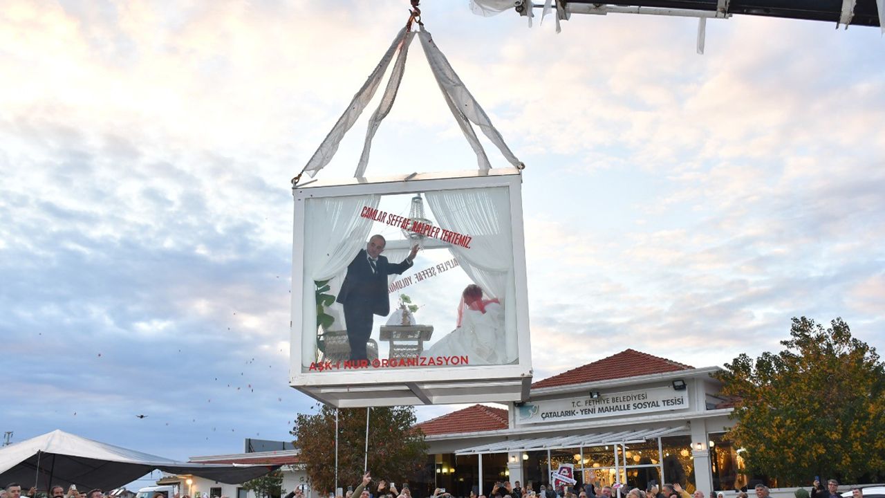 Fethiye ve Seydikemer ilçelerinin siyaset, esnaf ve ticaret dünyasından yoğun katılımın olduğu düğün töreninde gelin almaya özel yaptırılıp tıra yüklenen cam vitrin ile gidildi. Cam vitrin kız evinde vinçle tırdan indirilirken, gelin Merve Sarıman ve damat Berat Çetinkaya dualarla cam vitrine girdi. Cam vitrin vinçle tekrar tıra alkışlar arasında yüklendi. Gelini alan damat tarafları konvoy eşliğinde Seydikemer ilçesinden Fethiye’ye hareket etti. Tırda gelin ve damadı cam vitrinde görenler bu anı cep telefonlarıyla görüntülemeye çalıştı. Tır üzerinde cam vitrin içinde Çatalarık Mahallesi sosyal tesislerine çift geldiğinde çok sayıda davetli alkış tuttu. Cam vitrin içindeki çift burada da vinç yardımıyla tırdan yine alkışlar arasında indirildi.