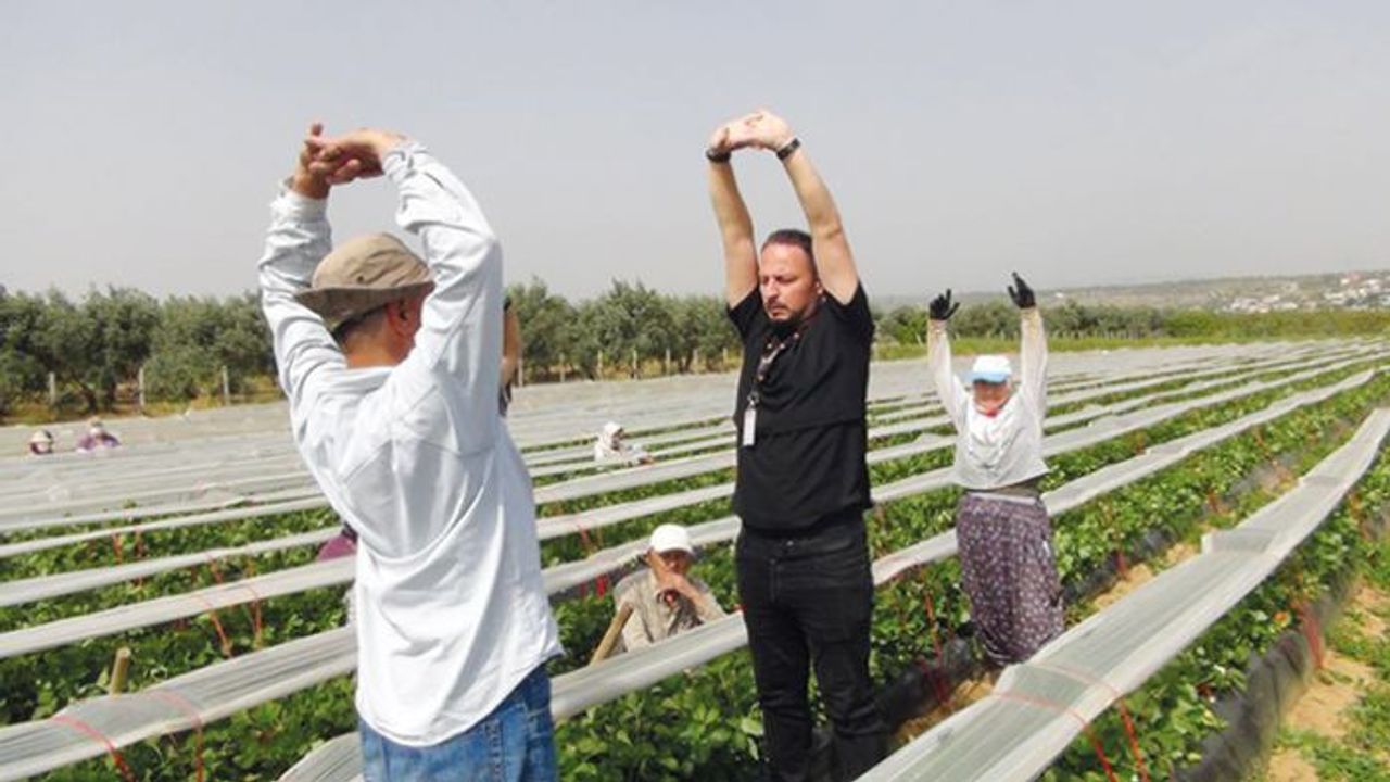 'Dünya Fizyoterapi Günü' nedeniyle Silifke Devlet Hastanesi'nden fizyoterapisti Mahmut Aydıner ve hemşire Rabia Cennet Tezcan tarlada çilek toplayan tarım işçilerini ziyaret ederek, ergonomi çalışma koşulları konularında bilgiler verdi. Tarlada fizyoterapist eşliğinde kültür fizik hareketleri yapan işçiler, doğru oturup kalkma konularında bilgi sahibi oldular. Fizyoterapist Mahmut Aydıner'in tarlada işçilere gösterdiği kültür fizik hareketlerini yapan işçiler bilinçlendirildi. Tarım işçileri hareketleri yapmakta zorlanırken, kültür fizik hareketleri sonrası rahatladıklarını belirtti. Çilek toplama esnasında ve sonrasında yapılan hareketleri öğrenmek için çaba harcayan işçiler, Silifke Devlet Hastanesi yetkililerine böyle bir hizmeti ayaklarına getirdikleri için teşekkür etti. Bugüne kadar tarlada yanlış bir duruş sergilediklerini belirten işçiler, öğrendikleri hareketleri bundan sonra uygulayacaklarını söylediler. (İHA)