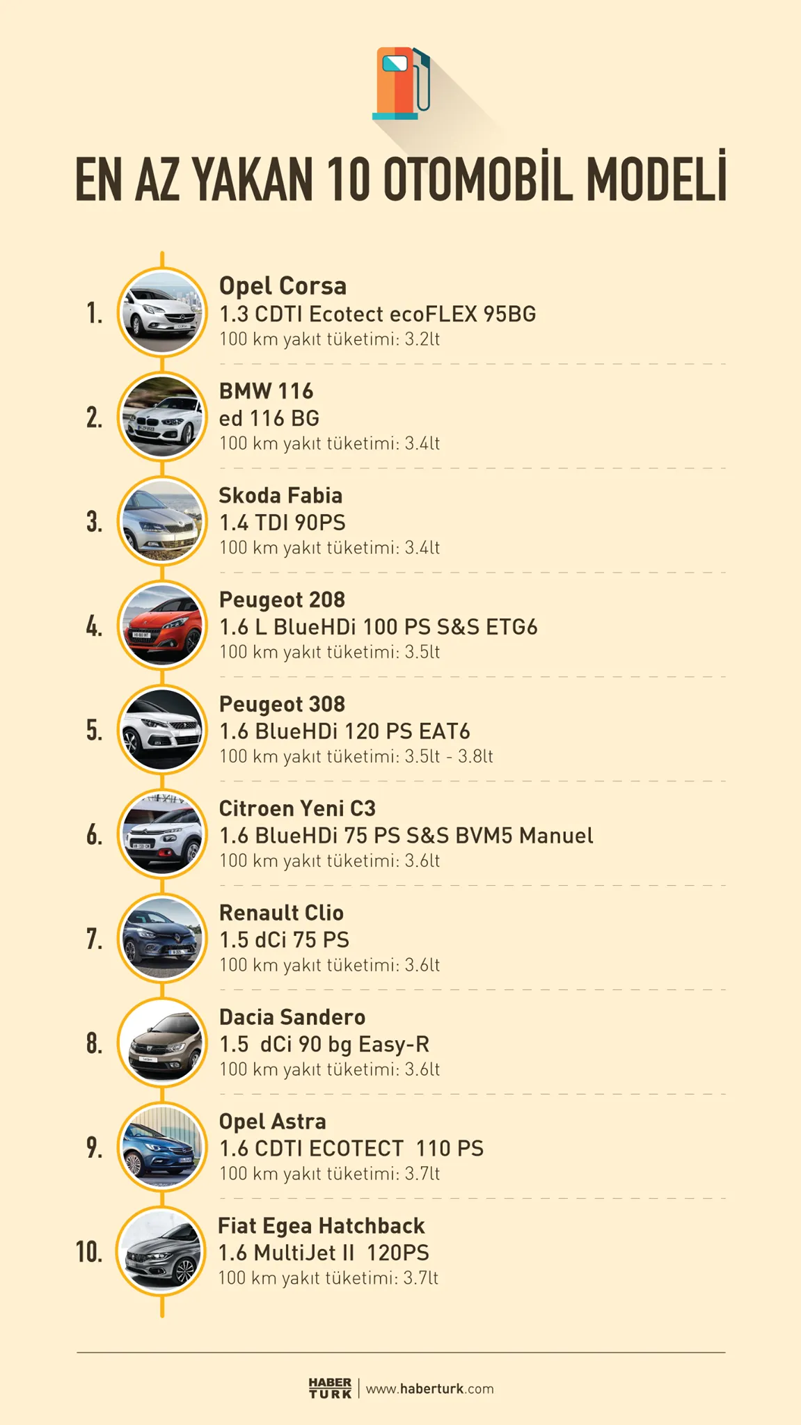 Bu listede yer alan otomobiller, şehir içi ve şehir dışı kullanımda düşük yakıt tüketimiyle dikkat çekiyor.