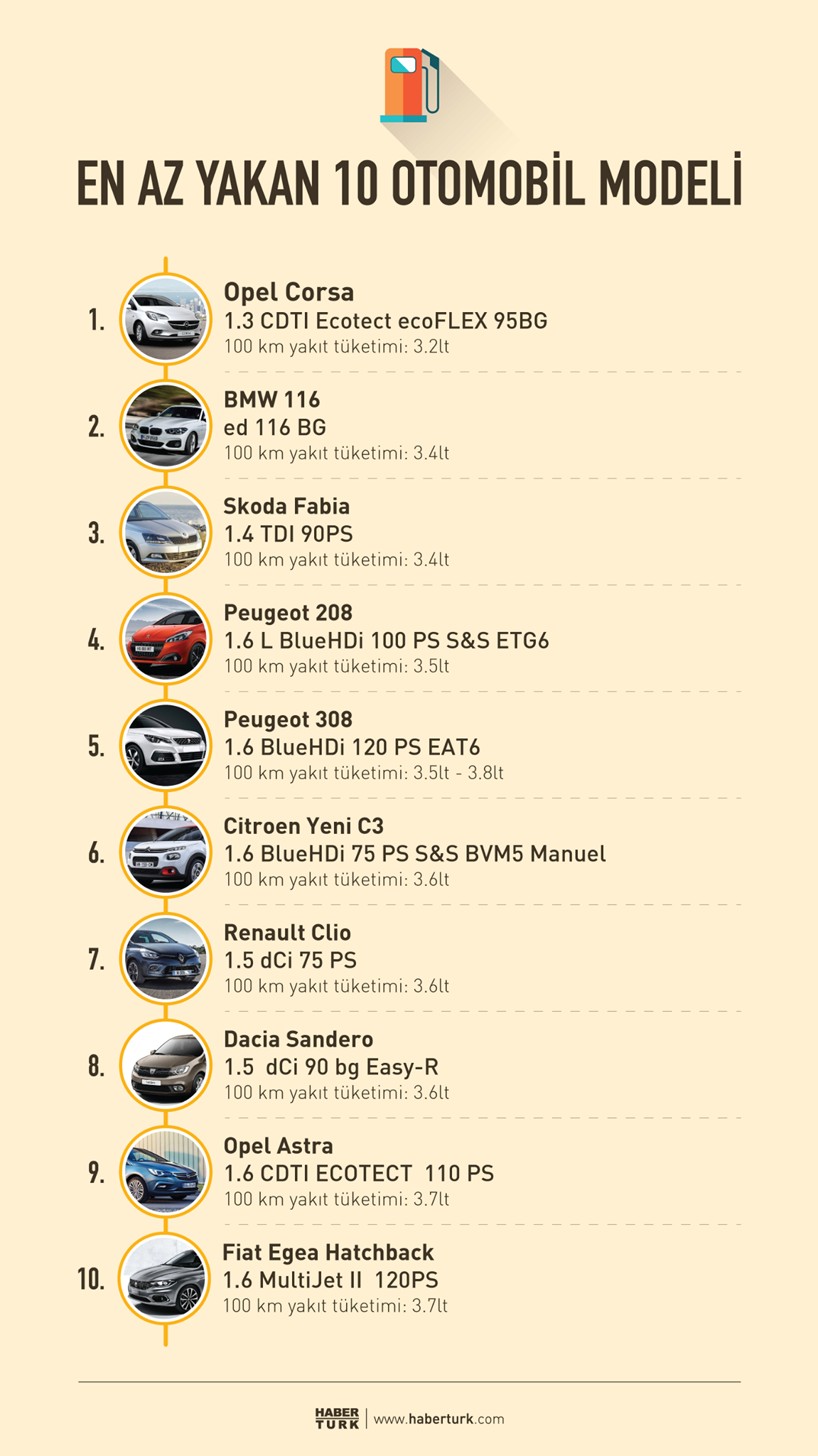 Bu listede yer alan otomobiller, şehir içi ve şehir dışı kullanımda düşük yakıt tüketimiyle dikkat çekiyor.