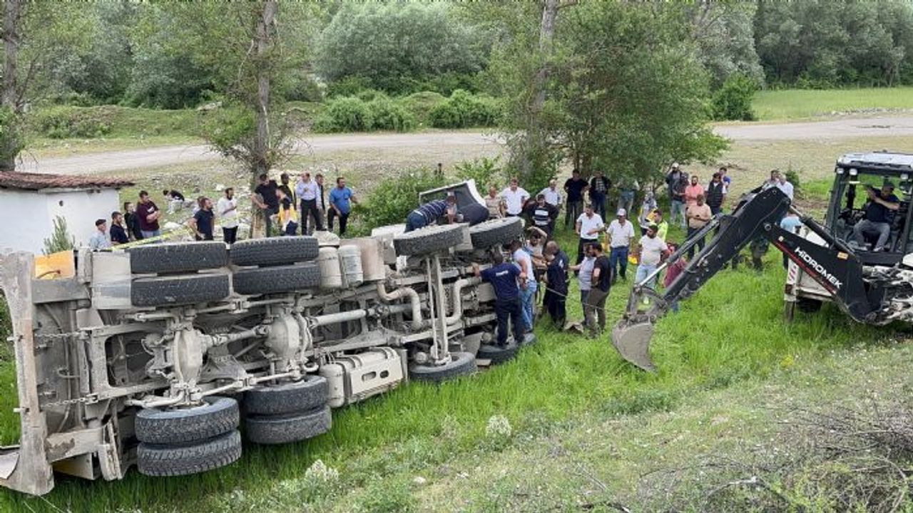 Freni boşalan hafriyat kamyonu şarampole devrildi, sıkışan sürücü 1 saatte kurtarıldı