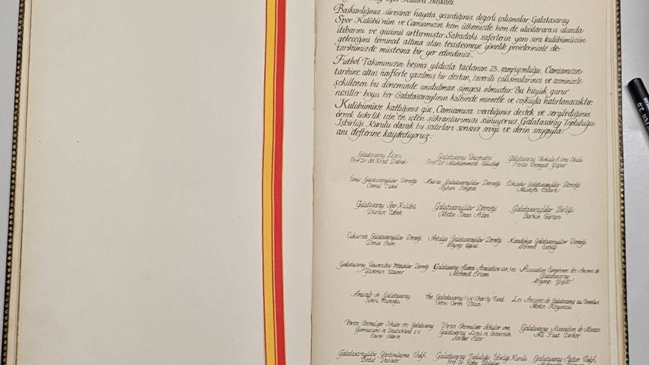 Galatasaray Topluluğu İşbirliği Kurulu’nun ortak kararı doğrultusunda, Galatasaray Lisesi anı defterine Başkan Dursun Aydın Özbek’e yönelik özel bir teşekkür yazısı hazırlandı.